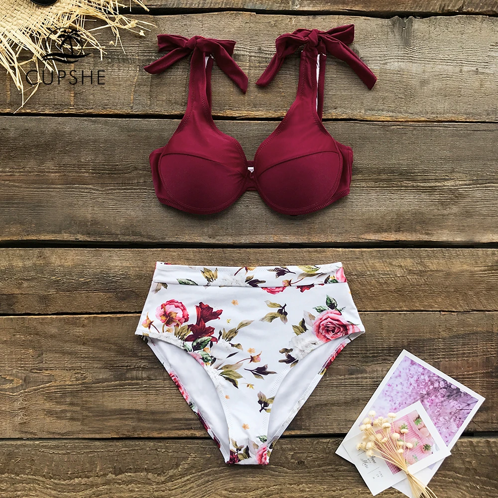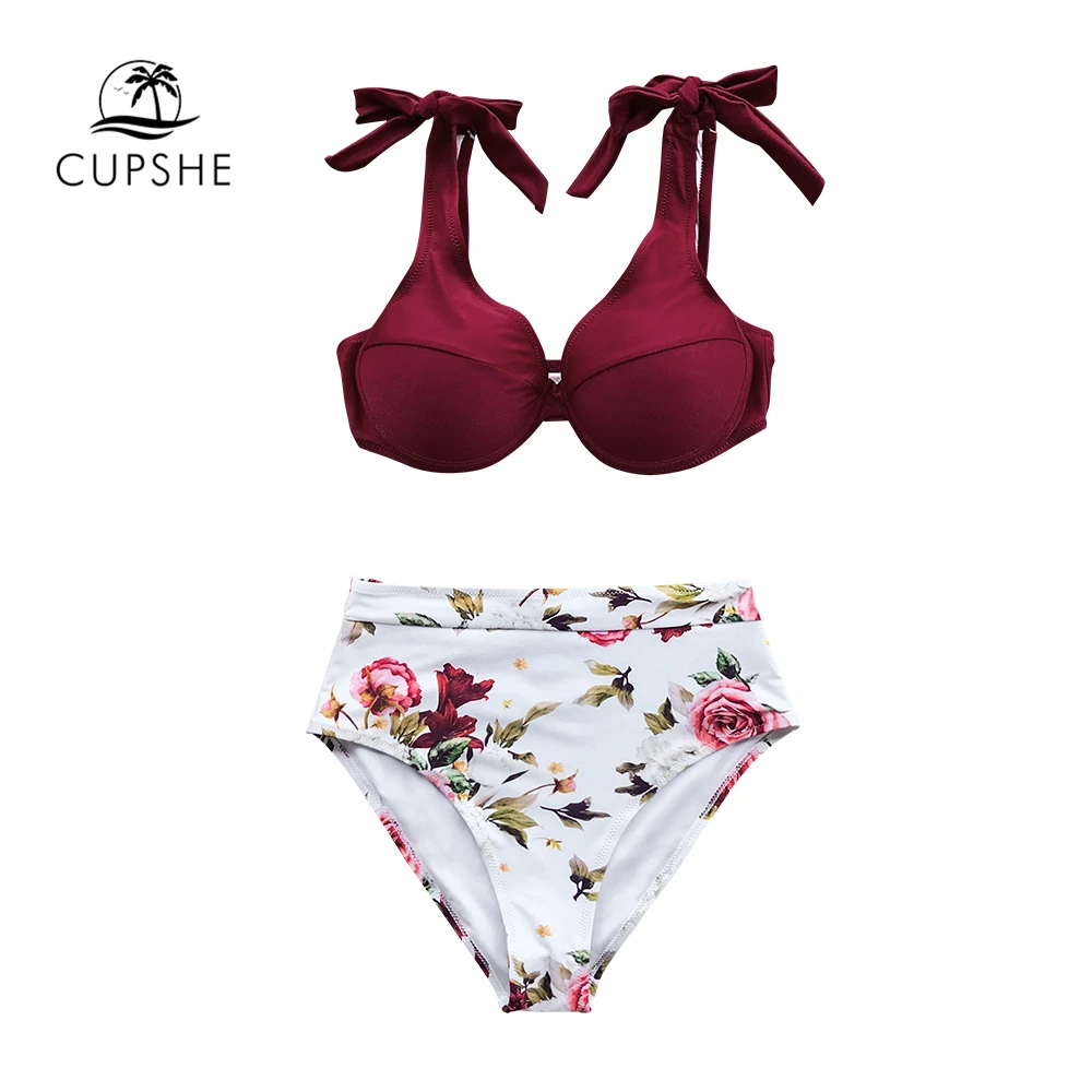 New Product CUPSHE Red Floral High-Waisted Push Up Bikini Sets Sexy Bow-knot Swimsuit Two Pieces Swimwear Women